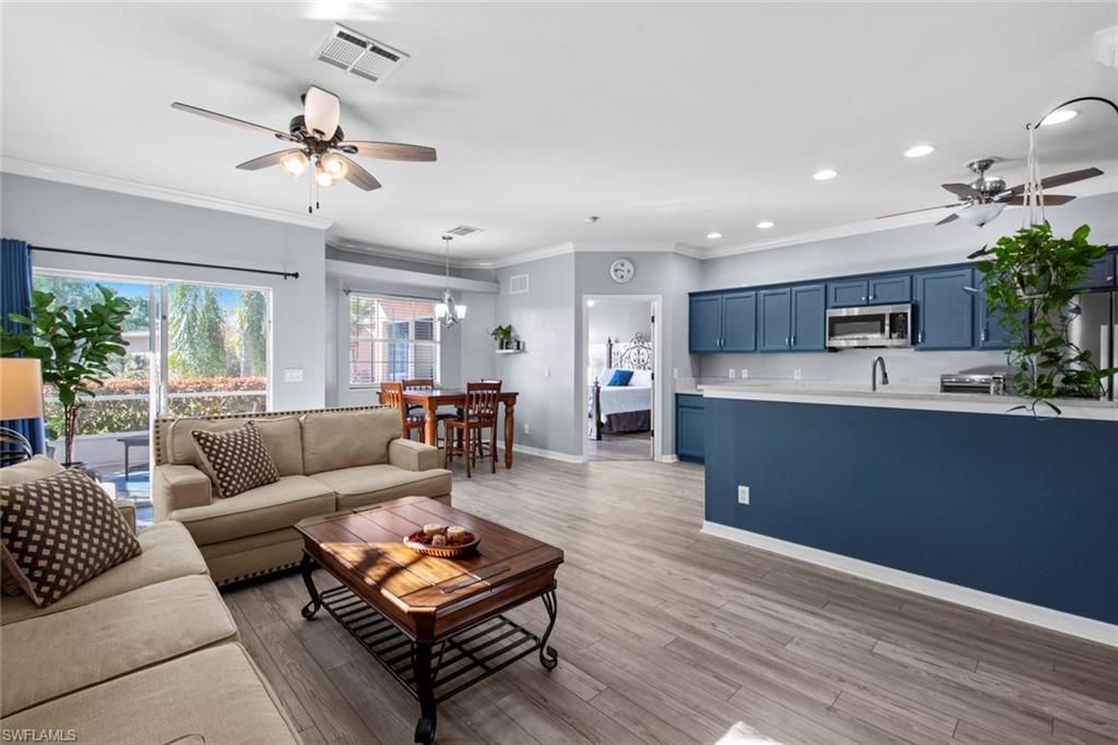 Meticulously maintained and beautifully updated! Discover this 1st floor 3 bedroom/2 bath/2 car-garage coach home offered TURNKEY/ fully furnished. Kings Green is a friendly, quiet community that is NOT AGE RESTRICTED *offers VERY LOW HOA DUES* NO FLOOD INSURANCE required* NO CITY TAXES * offers CITY WATER and is PET FRIENDLY. With over 1500 sf of spacious living and an abundance of closet space, this move-in ready and newly painted coach home features luxury vinyl flooring, crown molding, new quartz countertops, new kitchen cabinets and hardware, new GE & Whirlpool stainless appliances in 2022, new bathroom vanities and shower, new doors, 9-ceiling fans throughout and new garage door opener is just a few of the many upgrades! The A/C- 2018 w/added UV light, hot water heater -2016 AND a 1-year HOME WARRANTY is added for your peace of mind. Kings Green is just minutes from SR-82, I-75, Red Sox & Twins Spring Training, RSW airport, FGCU, beaches and much more. This is a must see!